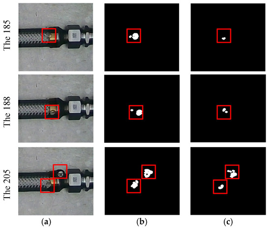 Figure 10 displays the results of normal leak detection, showcasing three frames of bubble movement at frames 185, 188 and 205 for comparison. Figure 10a presents the original video image, while Figure 10b,c show the detection outcomes of the OMD-ViBe algorithm, with the bubbles marked in red boxes for easier analysis. The figures reveal that the bubble profile obtained by the OMD-ViBe algorithm is more comprehensive than that of the original figure. This improvement is attributed to the dynamic threshold calculation method used by the OMD-ViBe algorithm, which has higher sensitivity to bubble appearance in the frame image, resulting in better detection outcomes.