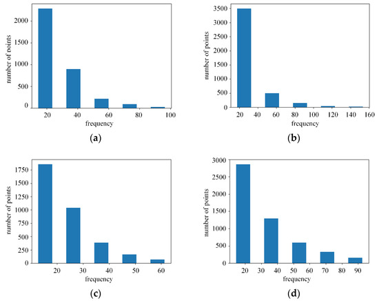 Histogram of the former points of interest superimposed: (a) Normal-ViBe, (b) Normal-OMD-ViBe, (c)Tiny-ViBe, and (d) Tiny-OMD-ViBe.