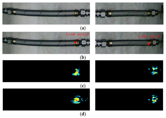 Leak detection can be detected by pressure changes, flow noise and image information. Li et al., Yang et al., Shi et al. and Juan et al. located the leakage position and quantified leakage volume based on the pressure change [1,2,3,4]. If more than one leakage occurs, finding it becomes easier. Song et al., Zhou et al., Lang et al., Lyu et al., Quy et al., Li and Xue et al. located leakage position by detecting flow noise [5,6,7,8,9,10,11]. Flow noise can overwrite leak point information and interfere with leak detection results. Wang et al., Guan et al., Yu et al., Penteado et al., Wang et al. and Jadin et al. used infrared thermal imaging to locate the leakage position [12,13,14,15,16,17,18]. The infrared thermal image detection method requires there to be a temperature difference between the leakage media and the environment.