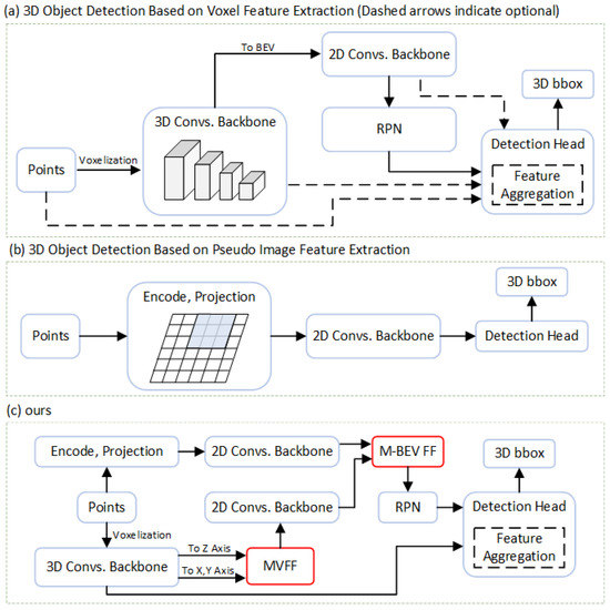 Lidar provides disordered point clouds. If we directly extract the features of the point clouds, numerous query operations will result, with low efficiency. Figure 1a,b show two commonly utilized methods for 3D object detection. In method (a) [3,4,5,6], first, the 3D space is discretized into voxels of the same size, and then the attributes of the points in each voxel are extracted as features of the voxel. At the voxel level, the 3D convolution operation is used to extract the features of the voxels. Second, the convolved voxel features are projected onto the 2D BEV input to the RPN (region proposal network) to predict the 3D region of interest (ROI). For a two-stage detector, the ROI is also refined in the detection head to achieve better 3D object-detection results. Method (b) [7,8,9] encodes the point cloud and directly projects it to obtain a BEV feature map. After feature extraction by the 2D backbone, the BEV feature map is input to the detection head to obtain detection results.