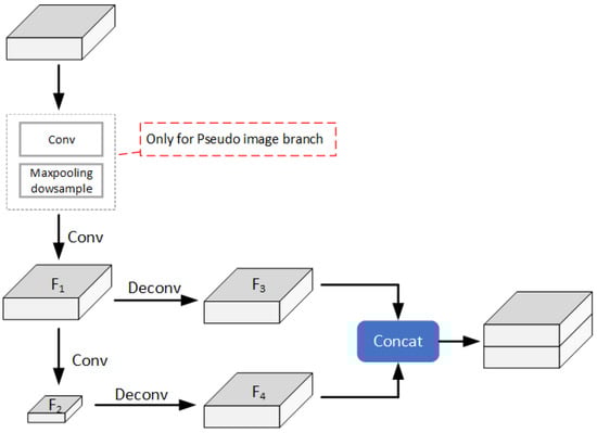 We input the created pseudo image into a 2D feature-extraction network for feature extraction. The 2D backbone network is shown in Figure 3. First, we use the convolution layer and maximum pooling layer to compress the size of the pseudo image, that is, we input the pseudo image of to obtain the original feature map of . Second, the original feature map is multilayer convolved while the size of the feature map is kept unchanged to obtain the feature map after the first feature extraction. Third, we use multilayer convolution to further compress the size of feature map , extract more abstract features, and obtain a new feature map . We input feature maps and into a deconvolution layer to adjust the number of channels of and restore to the width and height dimensions of the original feature map to obtain feature maps and . Last, we concatenate and in series as the output features of this branch and input them into the M-BEV FF module (Section 3.3).