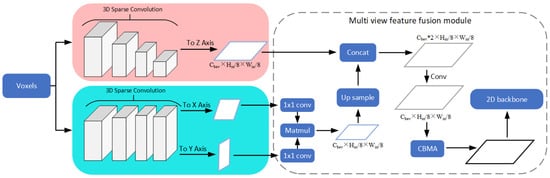 This branch discretizes the point cloud into voxels, extracts spatial features at the voxel level, and then transforms the features into the BEV to complete the task of the feature-extraction phase. Figure 4 shows the overall structure of the voxel-based feature-extraction branch, which is divided into two parts. The first part (red part) projects voxel features in the Z direction (BEV), and the second part (blue part) projects voxel features in the X and Y directions. The multi-view feature-fusion module fuses the feature maps from three views as output.