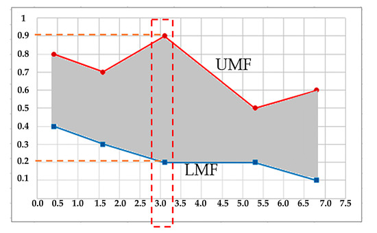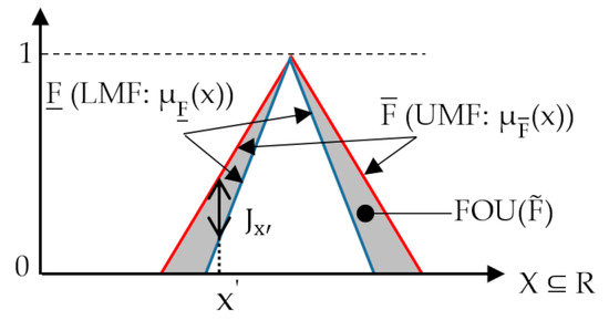 The area of a FOU is directly related to the uncertainty that is conveyed by an interval type-2 fuzzy set, and what follows, a FOU with more area is more uncertain than the one with less area. The lower membership function (LMF) and upper membership function (UMF) of are two type-1 membership functions and that bound the FOU, which are used to describe Jx, see Equation (4):