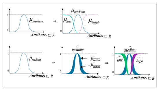 The idea of applying type-2 fuzzy sets is very simple and related to our previous research [22]. It is enough to change the values of the standard deviation of the Gaussian-type membership function of the fuzzy set medium to define the bounds of the FOU for the type-2 fuzzy set . In such a way, the assumed fuzzy sets {low, medium, high} can be replaced with the {} type-2 fuzzy sets. Figure 3 clarifies the issue. This transformation is done after rule induction and transformation into type-1 fuzzy rules.