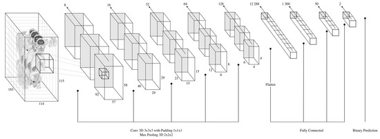 The preprocessed 3D PET data were converted into tensors and fed as input, together with their corresponding binarized “label” predictions as output, to a 3D CNN. The CNN architecture is illustrated in Figure 1.