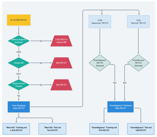 A predefined query search found 8125 FDG PET/CT scans in the EDS. Of these, 6050 had available reports and 5247 had processable cross-matched PET reports at the time of analysis (803 PETs with blank or incomplete reports dues to import or compatibility problems were discarded). After a visual evaluation of the 2D MIP projections of the overall available PET data, 252 exams were discarded due to poor quality (injected dose error, incomplete examination or patient movement artifacts that did not allow for the interpretation of the examination). Of the remaining 4964 PET data (3883 patients), 1084 PET data (986 patients) were included in the “unambiguous” dataset.