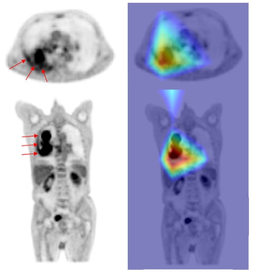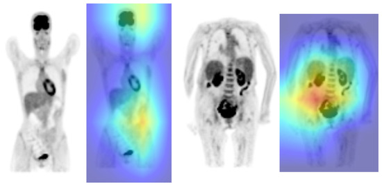 Fold 1 provided the best results, with a Sen of 94%, Spe of 100%, PPV and NPV of 100% and 94%, respectively, corresponding to an F1 score of 97%. The pretrained CNN then analyzed the independent remaining test set (108 PETs) and achieved a Se of 84% and Spe of 98%, a PPV and NPV of 98% and 85%, respectively, a F1 score of 90% and LR+ and LR− of 42 and 16%, respectively. The heatmaps derived from the gradient weighted-class activation map method (Grad-CAM) [16] for one patient are provided in Figure 4.