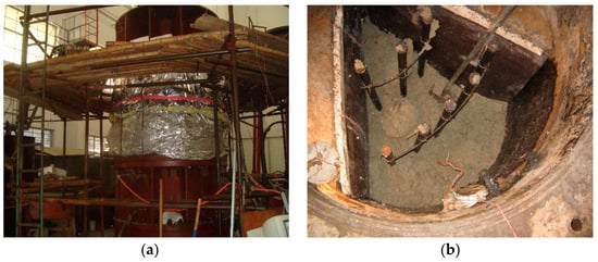 - The 60° wedge was selected as the test area in the inner space of the test bench, and the non-test area was poured with concrete and equipped with insulation asbestos board to form an adiabatic rigid boundary, as shown in Figure 2b.