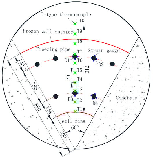 The test soil is sand and clay. The density of clay is 1870 kg/m3; the water content is 26.5%; the density of sand is 2080 kg/m3; and the water content is 18.2%. The temperature of frozen brine is −20 °C. The applied pressure load is 8 MPa. The order of filling soil is sand, clay, and sand from bottom to top, and the thickness of each layer is 0.5 m. T-type thermocouple and strain gauge are used to monitor soil temperature and frozen pipe strain, respectively. T-type thermocouple and strain gauge are arranged in three layers, which are arranged in the middle of sand layer, the interface of soil layers, and the middle of clay layer, respectively. In each layer, the strain gauges are arranged on the D1, D2, D3, and D4 freezing pipes, respectively, and each of them is pasted with 5 strain gauges, in which 1#, 2#, 3#, and 4# are vertical strain gauges, and 5# is transverse strain gauges, in order to measure the transverse strain of 1# caused by the Poisson effect. Ten T-type thermocouples are arranged outward along the shaft center, which are T1, T2, … T10 in turn. See Figure 3 and Figure 4 for details.