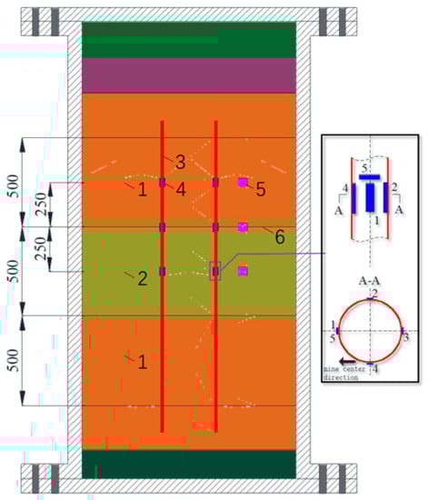 Vertical section drawing. 1—sand layer; 2—clay layer; 3—freezing pipe; 4—strain gauge; 5—T-type thermocouple; 6—soil layer interface.