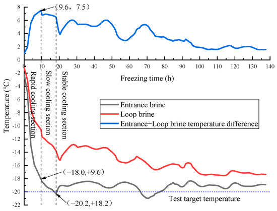(1) Brine temperature: According to Figure 5, the change curve of brine temperature to the circuit can be roughly divided into three stages: ① Rapid cooling section. After freezing for 9.6 h, the temperature of desalted brine decreased rapidly to −18 °C, and the average cooling rate reaches 1.88 °C/h. At the initial stage of freezing, the temperature difference of de-loop brine is small, and it rapidly increases to 7.5 °C with the increase in freezing time. ② Slow cooling section. After freezing for 18.2 h, the temperature of the desalted brine reaches the freezing design temperature of −20.2 °C. This process lasts for about 8.6 h, and the average cooling rate is 0.26 °C/d. The temperature difference of de-loop brine decreases gradually. ③ Stable section. The temperature of the desalted brine continuously fluctuates at −20 °C in this stage, with the fluctuation range of ±1.5 °C. The temperature difference of de-loop brine is gradually stable, indicating that the frozen wall is in good condition.