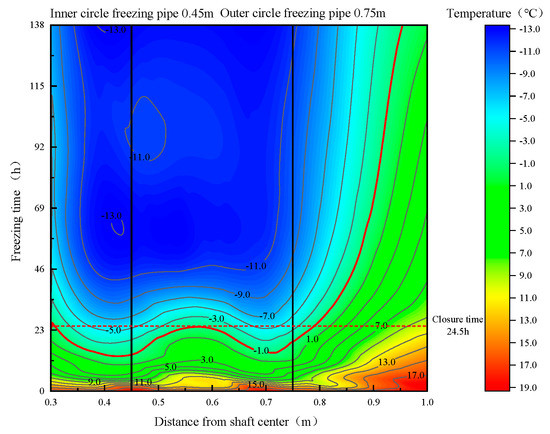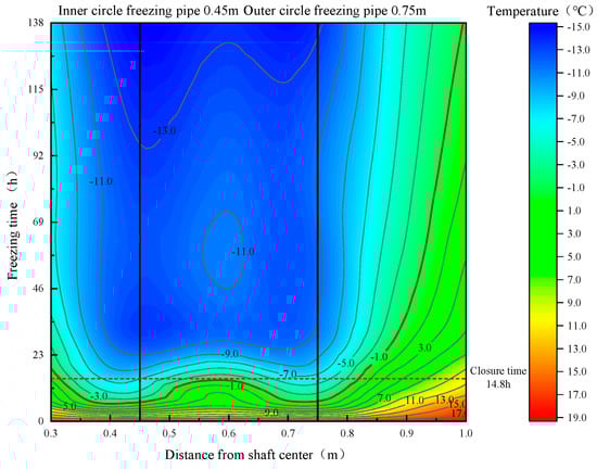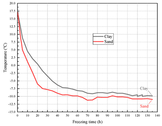 (3) It can be seen from Figure 6, Figure 7 and Figure 8 that the closure time and average temperature of the frozen wall in the sand layer are 14.8 h and −10.3 °C, while those in the clay layer are 24.5 h and −9.0 °C. It is mainly because the clay contains more bound water, while the sand contains less. In addition, the freezing of bound water requires more cooling than free water, and the specific heat of clay particle skeleton is larger than that of sand. Therefore, the cold absorbed by clay freezing is more than that of sand, which makes the freezing efficiency of clay less than that of sandy soil, resulting in the closure time and average temperature of frozen wall in sand layer being lower than those in clay layer.