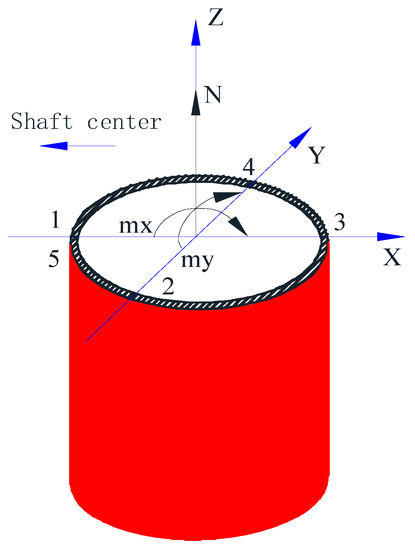 The stress deformation problem of freezing pipe can be simplified as the plane strain problem. On any cross section of the freezing pipe, the total strain at any point can be simplified as pure bending strain in the X direction, pure bending strain in the Y direction, and pure tension and compression strain in the Z direction, as shown in Figure 9. Furthermore, 1#, 2#, 3#, and 4# are vertical strain gages; 1# is near the shaft center, and 5# is transverse strain gauge. Their measured values are represented by (n = 1, 2, 3, 4, 5), as shown in Figure 9. The temperature strain in all directions of the freezing pipe is the same.