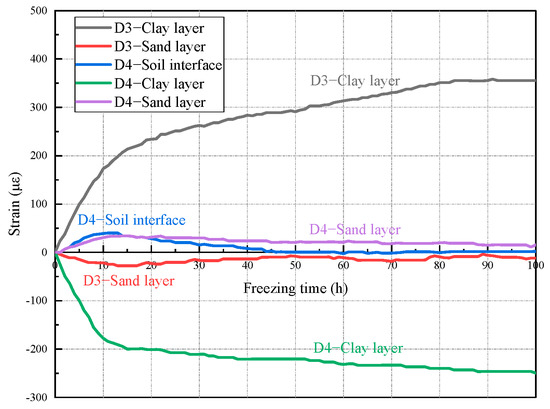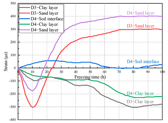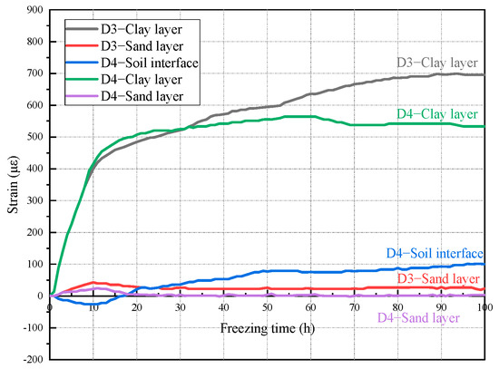 ④ The D4 freezing pipe is basically in the tensile state at the soil interface. During the whole freezing process, increases slightly at first and then decreases gradually, but it is basically very small. It may be because the D4 frozen pipe is mainly tensile strain in the sand layer and compressive strain in the clay layer, so these two kinds of soil layers will form a neutral strain surface at the interface of soil layer. As a result, the vertical tension and compression strain of the frozen pipe is not prominent at the interface of the soil layer.