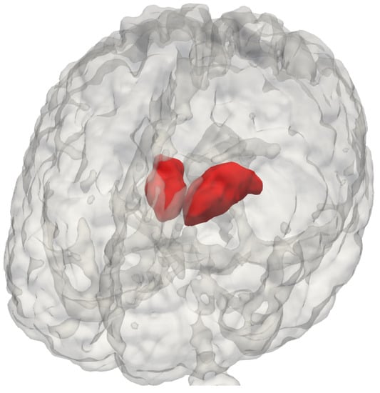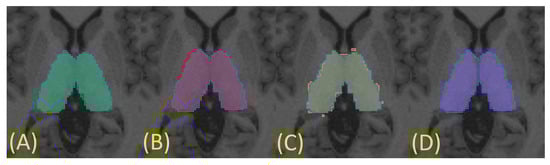 - Makowski, C.; Béland, S.; Kostopoulos, P.; Bhagwat, N.; Devenyi, G.A.; Malla, A.K.; Joober, R.; Lepage, M.; Chakravarty, M.M. Evaluating accuracy of striatal, pallidal, and thalamic segmentation methods: Comparing automated approaches to manual delineation. Neuroimage 2018, 170, 182–198. [Google Scholar] [CrossRef]