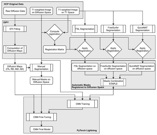 Another crucial process applied to the data is the registration, which placed the diffusion- and T1-weighted images, and the masks, within a single space, allowing them to be simultaneously used by the CNN.