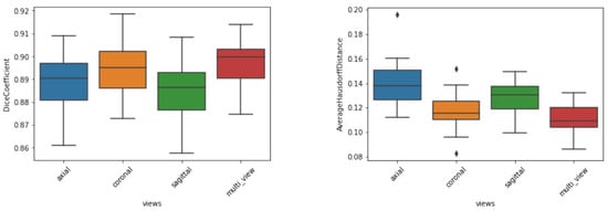 The preliminary experiments also helped to define the approach regarding single or multiple views. Using all available channels as input, the dice metrics of the test dataset (Figure 8) indicate that the sagittal and axial views led to the worst results, whereas the coronal and combined views led to the best results. We also note that the aggregated view yielded the best AHD in terms of both average and standard deviation, indicating better and more stable segmentation behavior. This occurred because the aggregation of views corrects any misclassified voxels that appear far from the segmented thalamus. Accordingly, view aggregation was chosen as the approach to be used.