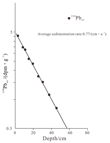 210Pb ages of the core site were carried out in the laboratory at the Faculty of Geography at Yunnan Normal University in Kunming, China. Due to the complete drying up of Yilong Lake in 1981 and 2009, which changed the conventional sedimentation mode, the Constant Initial Concentration (CIC) model was selected for calculation under significant hydrological changes [62,63]. The average sedimentation rate was 0.77 cm/a, and 64 cm of sediment represented the time from 1938 to 2020 (Figure 2).