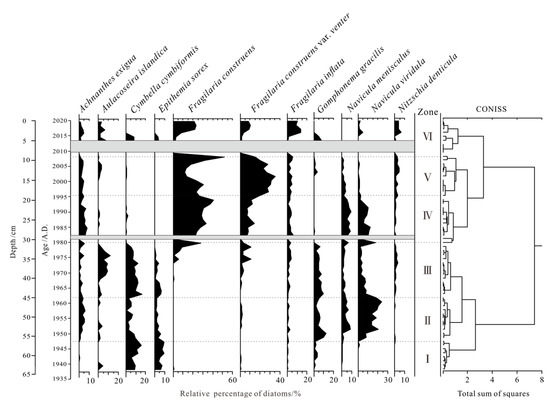 A huge change in diatom assemblage was found in this zone. The abundances of F. construens and F. construens var. venter rapidly increased and became the main dominant species. Meanwhile, A. islandica, C. cymbiformis, E. sorex, and G. gracilis disappeared. Yilong Lake dried up in 1981 A.D., which might be the reason for the diatom’s absence.