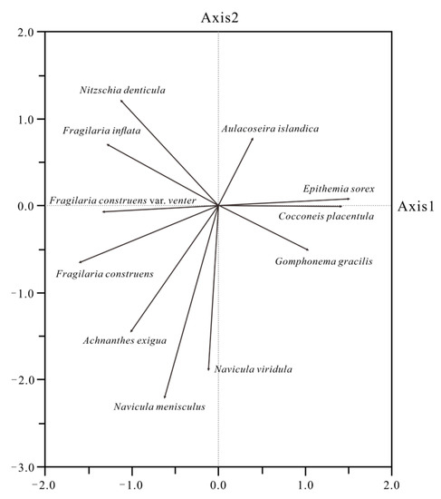Similarly, the diatoms in the positive direction of axis 2 mainly include A. islandica, E. sorex, and C. cymbiformis. A. islandica is commonly found in oligotrophic to mesotrophic waters with high latitudes or altitudes [80,81], including boreal lakes, such as Winnipeg Lake and Forest Lake in North America [82]. E. sorex is a benthic species and likes to live in clean waters with low nitrogen [83]. C. cymbiformis is widely distributed in the arctic and temperate zones, mainly in oligotrophic lakes and streams [84].