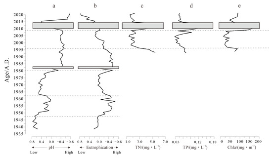 Axis 1 and 2 of the PCA ordination, which are the most important factors, represent pH value and eutrophication, respectively. Each sample in depth was given a sample score on both axis 1 and 2 after being calculated by PCA. Then all the sample scores on axis 1 and 2 could be obtained. Since axis 1 represents pH value, so sample score 1 should be the semi-quantitive data of it. The same with eutrophication. Therefore, the pH value (Figure 6a) and eutrophication (Figure 6b) reflected by the diatom assemblage of Yilong Lake could be obtained between 1938 and 2020. Comparing with the measured data of TN (Figure 6c), TP (Figure 6d), and Chla (Figure 6e) between 1993 and 2020, we could infer the evolution of water quality in Yilong Lake from 1938 to 2020. Six stages were divided by changes in pH value and eutrophication as follows.