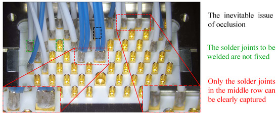 However, it is not appropriate to directly use existing YOLOv5 for solder joint quality inspection of aviation plugs for the following reasons. Small solder joints in the complex background: As shown in Figure 2, the solder joints are arranged in a regular, horizontally staggered pattern. While the appearance of the rear solder joints is inevitably obscured by the cables in the front solder joints. In addition, the aviation plug contains multiple small solder joints, and the positions to be welded are not fixed. Therefore, directly applying the YOLOv5 model to recognize these small solder joints from the complex background is difficult. Difficulties with image collection: YOLOv5 is a data-driven model that requires many images for training. Therefore, image collection is extremely critical and directly related to the final detection performance. However, because the solder joints in aviation plugs have a non-planar, layer-by-layer stack structure, they are at different object distances from the lens, meaning that the camera cannot directly capture a complete and clear image. As shown in Figure 2, only the intermediate region of the captured image is clear, while the ends are slightly blurred, which affects the assessment of the solder joint quality.