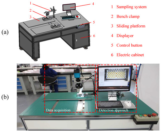 The scheme of solder joint quality detection system for aviation plugs. (a) Schematic diagram. (b) Prototype platform.