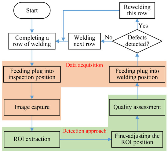 After obtaining enough training images with high-quality annotations, an accurate two-phase approach for weld quality detection is presented in this section. It consists of ROI extraction and quality assessment, which can provide the distance for fine adjustment of the sliding platform and achieve accurate defect detection respectively.