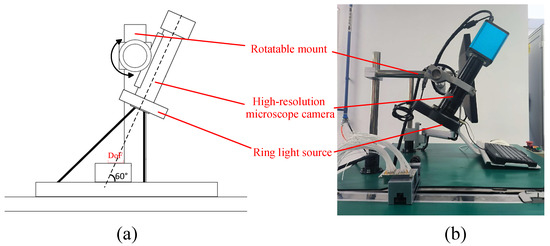 The designed image sampling system mainly consists of three parts, including a rotatable mount, a high-resolution microscope camera, and a ring light source, as shown in Figure 5. As you can see from Figure 1, the aviation plug contains multiple rows of small solder joints, the smallest of which is just 1 mm. Therefore, with the aid of an auxiliary microscope lens (0.5× magnification), an industrial camera with a pixel size of 0.01 mm and a resolution of 4000 × 3000 pixels, capable of capturing 30 frames per second (FPS) is adopted. The rotatable mount is responsible for the angle adjustment of the shot. Due to the non-planar, layered structure of solder joints in the aviation plug, the vertical acquisition angle cannot capture the surface characteristics of the solder joints. To alleviate this problem, we use an oblique angle to take the picture as shown in Figure 5. In practice, to avoid the problem of occlusion between adjacent rows of solder joints, the angle between the optical axis of the camera and the horizontal plane is set to 60. However, because the angle of the shot is inclined, each row of solder joints is not at an equal distance from the lens. As a result, a camera with a given depth of field (DoF) cannot cover the entire image, resulting in only the middle region of the image can be clearly captured, while the others are slightly blurred. For this reason, a two-phase strategy is used in the detection approach. To provide sufficient and uniform light, a ring light source with a power of 5 w is mounted at the end of the camera lens. Meanwhile, the camera and light source are kept on a center line for a good shot. The sampling system is installed in a fixed position, and only moving the aviation plug via a sliding platform is needed to capture the characteristics of these small solder joints. In addition, the captured images are transferred to the computer via a USB cable for subsequent processing.