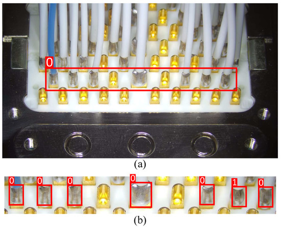 Once enough sample images are available, they need to be labeled to provide ground truth, which is extremely important for model training. The process of labeling is to manually mark the region of interest on the image with a bounding box according to the objective of the model training. For example, in Figure 6, we show the different annotations that are required for ROI extraction and quality assessment. The number 1 in Figure 6b means the defective solder joints. During the labeling, each training image is labeled by two professional quality inspectors from the factory. When two people have different opinions, the sample is discarded, which effectively reduces mislabeling due to subjective judgment. Meanwhile, an open-source graphical image annotation tool LabelImg is used to make labeling easier. In addition, the obtained annotation information is stored in a text format for the training of YOLOv5.