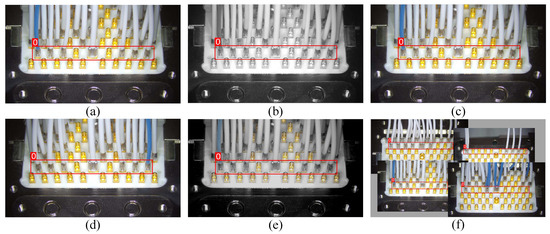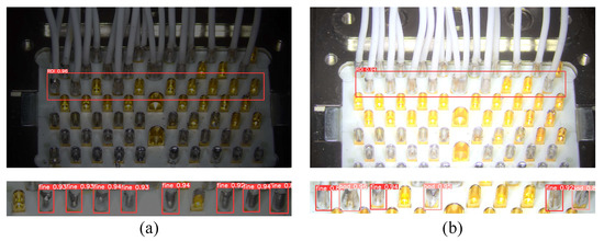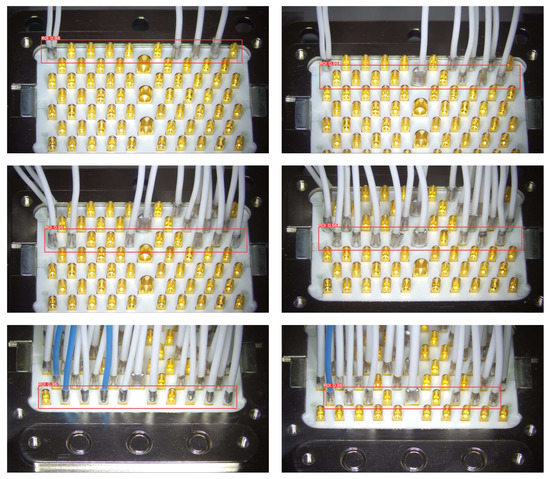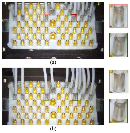 Figure 12 shows the importance of ROI extraction for the solder joint quality inspection on aviation plugs. From Figure 12a, we can observe that the row of solder joints to be inspected, located at the top or bottom of the aviation plug, are not within the DoF of the camera before the fine-adjusting, so their surface is blurred. Obviously, direct inspection at this moment is prone to false detections. After the ROI extraction, the row of solder joints to be inspected is fine-adjusted into the camera’s DoF using a sliding platform. Consequently, the captured images of the solder joints shown in Figure 12b become clear and shiny, which will facilitate the subsequent quality assessment task.