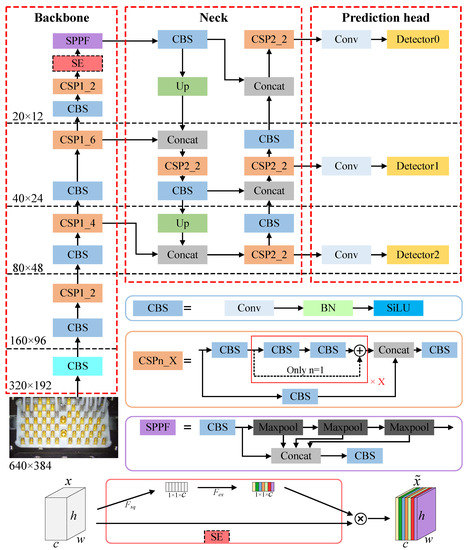 The backbone module is designed to extract multi-scale features of the input image through layer-by-layer convolution. It consists of five CBS blocks, four CSP1_X blocks, one SPPF block and one SE block. The CBS block is used to achieve image downsampling, and it is stacked with a convolution operation, a batch normalization (BN), and a SiLU activation function. In practice, with the exception of the first CBS block, which uses a convolutional layer with kernel size 6, stride 2, and padding size 2, the others in the backbone are all with kernel size 3 and stride 2. The SCP1_x block is derived from the cross stage partial network [45], and used to enhance model learning capability while ensuring lightweight. It splits the input feature into two paths. One path passes through a CBS model followed by X residual structures, while the other goes directly through a CBS block. Finally, the outputs of the two paths are concatenated and then go through a CBS model. The SPPF block is a fast version of spatial pyramid pooling, which can integrate the feature maps of different receptive fields at a low computational cost. As shown in Figure 8, firstly, a CBS block with kernel size 1 is used to halve the feature channel, and then three serial Maxpool operations are used to obtain three feature maps of different receptive fields, and finally, the above four outputs are concatenated followed by a CBS block with kernel size 1 to restore the original feature channel.
