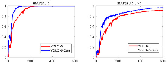 The results in Figure 13 are consistent with the conclusion drawn from Table 4. We can clearly observe from the comparison curves that as the iteration increases, the mAP@0.5 values of two models gradually stabilize and reach a similar maximum value. It should be noted that the mAP@0.5 curve of YOLOv5-Ours rises more steeply and peaks earlier, meaning it is easier to optimize after improvement. Another noteworthy finding is that the mAP@0.5:0.95 curve of YOLOv5-Ours is consistently higher than that of YOLOv5 throughout the training process.