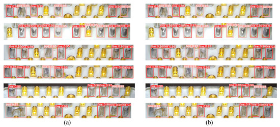 To verify the robustness of the method used for ROI extraction to lighting, we test it on the ROI extraction dataset with different levels of lighting conditions. As can be seen in Figure 11, our method has strong light resistance and can always locate the ROI accurately. From Table 3, we can observe that the used model, YOLOv5, consistently maintains a high performance regardless of whether the light gets brighter or darker. The above numerical and visual results consistently show that the original YOLOv5, after fine-tuning, is fully competent for the ROI extraction task. Meanwhile, it has excellent robustness to lighting, making it ideal for use in industrial scenarios where the environment is uncertain.