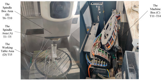 The thermal error experiment was carried out on a five-axis CNC machine tool named as DMG-DMU65, and the thermal error of its spindle was detected using the five-point measurement method according to ISO 230-3:2020 [50]. In this way, the thermal error data in the X, Y and Z directions were obtained. In practice, the temperature change area includes not only the spindle area, but also other heat source areas, so it is essential to settle a certain amount of temperature transducers in the non-spindle area. Consequently, 15 temperature transducers were arranged on the CNC machine tool in the spindle area, spindle box area, machine box area, and working table, as shown in Figure 1.
