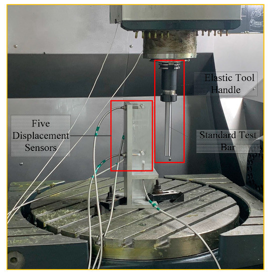 Five eddy current displacement sensors under the name of ML33-02-00-03 were used as the X1, X2, Y1, Y2 and Z displacement measuring components of the spindle of the machine tool respectively. They were installed with customized fixture, as shown in Figure 3. The precision of the sensors can reach 0.1 μm after calibration. In addition, the standard test bar replaced the cutter as the test object, and thermal errors of the spindle that were transferred to the check bar were manifested as its axial and radial displacement.