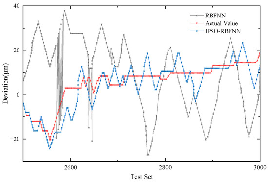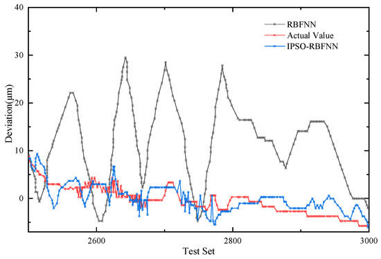 Figure 13 and Figure 14 show that the predicted values of the thermal error in X2 and Y1 direction at 800 rpm based on the IPOS-RBFNN model are both closer to the actual values than the RBFNN model. In the same way, two metrics, MSE and RMSE, are used to evaluate the predictive performance of the models.