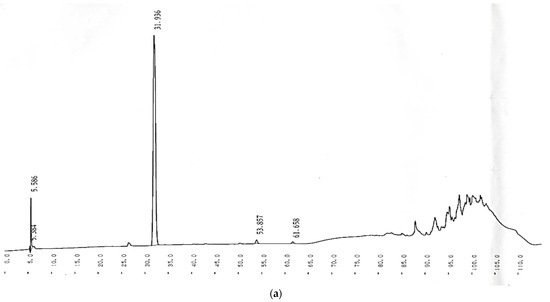 The average retention times for hesperidin, neo-hesperidin, and naringin were identified as 31.98 min, 35.01 min, and 29.55 min, respectively. Figure 1 displays the representative HPLC profiles of hesperidin [Figure 1a] and orange extracts from waste orange peels [Figure 1b]. The result indicates that the main composition of orange extracts was hesperidin, which agrees with the observations of Feng [40] and Feng et al. [31,38]. The investigated ranges for the determination of all analytes exhibited good linearity in the calibration curves, with R2 > 0.9999. The hesperidin content in orange extracts was calculated to be 46.82 ± 5.23 μg/40 g dried orange. The dried navel orange peels extracted by 70% ethanol solution with successive extraction with ethyl acetate were investigated [41]. Hesperidin content was reported to be 31.45 ± 0.38 μg/dry weight of extracts [41]. The orange extracts were also detected by terahertz spectroscopy (THz), and their THz spectra were similar to those of the hesperidin standard [31], which is consistent with current observation where the main component of orange extracts was identified to be the hesperidin. Hesperidin was reported to be 100% detected in the sweet orange, whereas only a 20% probability of naringin can be found in the sweet orange [38]. For neo-hesperidin, it is not detected in sweet orange peels [38].
