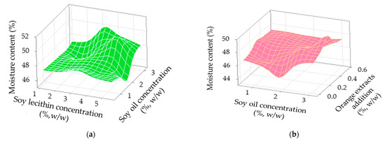 - Response surface methodology was used to investigate the effect of different modification processes with varying concentrations of orange extracts on moisture content, achieving an R2 of 78.28% and an insignificant lack of fit. Moisture content increased to 48–50% when a high soy lecithin concentration (>3.9%) was associated with a higher soy oil concentration (2.0%) or a higher concentration of soy oil (>2.3%) combined with an addition of orange extracts between 0.05% and 0.40%.