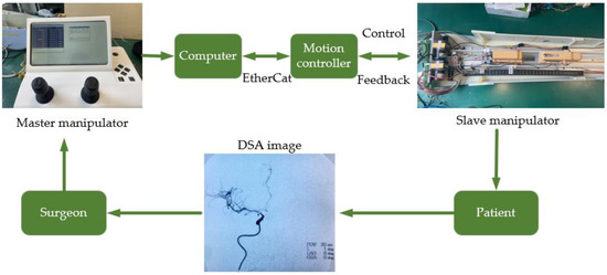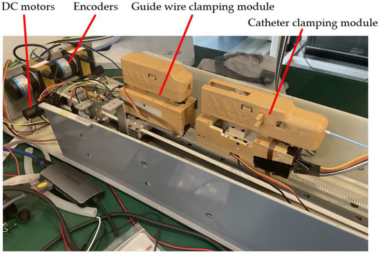 The structure of the slave is shown in Figure 2. The linear slide platform is provided with a guide wire clamping module and a conduit clamping module. Two DC motors (EC-22, Maxon, Sachseln, Switzerland) are installed at the end of the platform and are responsible for rotating the tracks to propel the modules. Each clamping module is also equipped with a brushless DC motor (EC-22, Maxon, Sachseln, Switzerland), which is responsible for controlling the rotation of the catheter or guide wire through a gear structure. When the surgeon operates the master manipulator, the motion information on the master side is transmitted to the motion controller using the EtherCat communication protocol. The motion controller transmits the acquired signal to the slave and drives the slave motor to push the guide wire and catheter into the patient’s blood vessel. In the meantime, the DSA system captures the image information of the catheter and guide wire during the operation, and displays the image to the monitor, enabling the surgeon to ensure the safety of the operation.