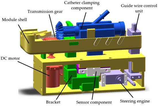 The structure of the catheter clamping module is shown in Figure 3. The catheter is fixed on the catheter clamping component. The advance and retreat of the catheter are controlled by the DC motor at the end, and the rotation of the catheter is controlled by the DC motor inside the clamping module. The internal DC motor turns forward or reverse at a fixed low speed, so the catheter can rotate left and right through the transfer gear. A steering engine is installed inside the clamping module, which is connected to the guide wire control unit through a steel wire. When the steering engine turns to a fixed angle, the steel wire is pulled and the guide wire control unit is pressed down to realize the role of the guide wire.