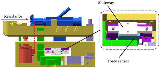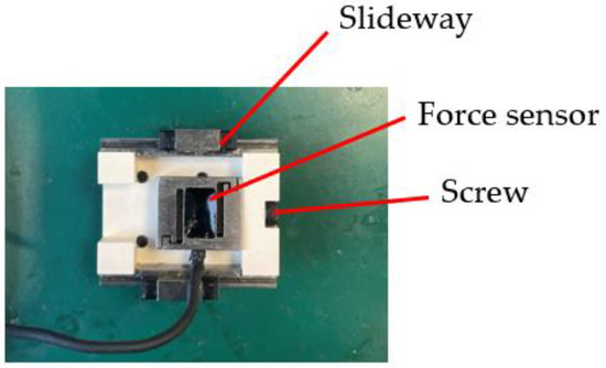The module is integrated with a force sensor assembly, which is integrated under and fixed to the catheter clamp assembly. The two sides of the force sensor are fixed by sliding rails. When the catheter is pushed against resistance, the force is transmitted through the mechanical structure to the force sensor below. The schematic diagram of force conduction is shown in Figure 4. Figure 5 shows the force sensor in the module.