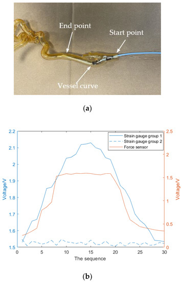 We set the reference voltage of the amplifier circuit of the strain gauge to 1.5 V, and adjusted the amplification factor to make the output voltage range between 0–3.3 V according to the bending degree of the conduit, which is convenient for MCU when reading the voltage signal. The sampling rates of the two groups of strain gauges in the catheter head and the force sensor in the clamping module were consistent, which is convenient for unified analysis of multiple groups of data. In order to test the reliability of the strain gauge and the force sensor, the vascular model was used to carry out the catheter push experiment. Figure 8a shows the vascular model used in a push, and the data obtained is shown in Figure 8b. The blood vessel model was 3D printed with transparent resin. During this push, the catheter passed through a vessel with a curve of about 30°. The force sensor in the clamping module detected the resistance in front of it. The strain gauge output voltage at the head also experienced a rise. As the head of the catheter passed through the curved vessel, the voltage of the strain gauge fell back to the reference voltage again. It can be seen that the strain gauge at the catheter head and the force sensor at the catheter end had an obvious response to the bending of the vessel during pushing.