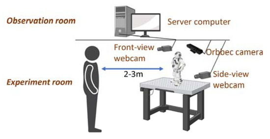 The study was arranged in a research laboratory, as illustrated in Figure 3. The robot was standing on a table (36 inches high) so the participant could see the full body of the robot. The participant and the robot were 2–3 m apart. Two webcams recorded the full-body movements of the participants from a frontal view and a side view, respectively. An Orbbec Astra camera [41] was placed beside the frontal view webcam to record the full-body movements of the participants (Figure 1, right). The Orbbec camera could track the position of 19 skeleton joints that outline the posture of the participant at a speed of 30 frames per second.