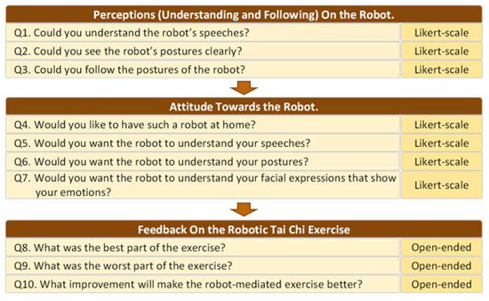 This survey collected participants’ demographic information, current health conditions, experience with and attitude toward physical exercise (including Tai Chi), and experience with assistive technology (e.g., Alexa and motorized walkers) and robots. Multiple selection, open-ended, and Likert scale (from 0 (not at all) to 9 (very much)) questions, as summarized in Figure 4, were used.
