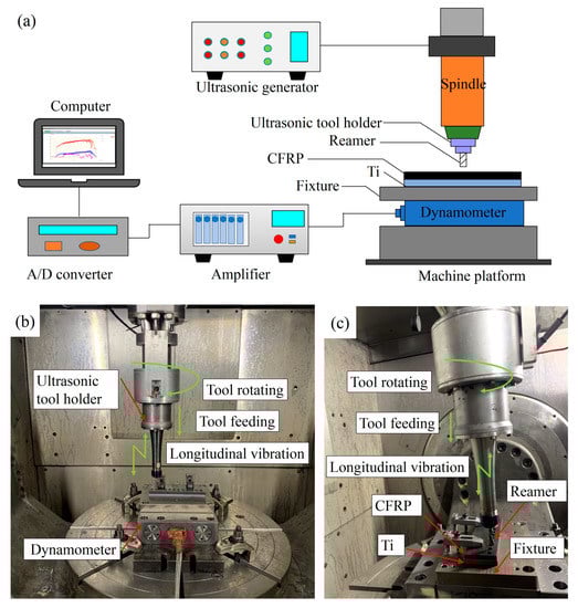 The experimental setup diagram of UVR for CFRP/Ti stacks is shown in Figure 1a. The adopted experimental platform is a 5-axis vertical machine center (KMC600SU, Kede Machine Tool Co., Ltd., Dalian, China), which includes the UVR unit and the thrust forces measurement unit, as shown in Figure 1b. The UVR unit consists of an ultrasonic generator, a UAR tool holder, and a carbide reamer. The ultrasonic generator converts conventional (220 v, 50 Hz AC) power into high-frequency electrical energy, which will supply the piezoelectric transducer. The piezoelectric transducer converts the high-frequency electrical energy into mechanical vibrations. The ultrasonic vibrations from the transducer are amplified and transmitted to the reamer, which causes the reamer to vibrate axially at high frequency. It has been proven that the greater the output power, the greater the amplitude. The amplitude of the ultrasonic vibrations can be adjusted by varying the output power of the power supply.