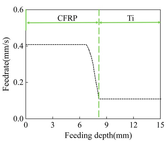 In the preliminary experiment, the thrust forces and tool wear of CFRP and titanium alloys under different feeds were compared at 200 rpm. According to [22], the feed rate range of CFRP and the titanium alloy is 5, 10, 20, and 25 mm/min. Under these parameters, the CFRP is suitable for 25 mm/min feed and the titanium alloy is suitable for 10 mm/min feed. The feed speed of the two materials is more than three times different. In the case of a similar feed speed, only the smaller one can be used, which will reduce the efficiency of processing. It has been shown that a low feedrate should be used for UVR of Ti, but high feedrate could be used for UVR of CFRP [17]. In addition, using a variable feedrate led to a lower cutting force. Therefore, the experiments were carried out using different cutting parameters according to the different material properties, and lower thrust forces and higher machining efficiency were achieved compared to machining using the same parameters. In this experiment, a faster speed of 0.41 mm/s was used to ream holes in CFRP for machining and a slower speed of 0.16 mm/s for machining titanium alloys. Near the end of CFRP machining, the feedrate changes from 0.41 mm/s to 0.16 mm/s. The pattern of variation of feedrate with feed depth is shown in Figure 3. The other parameters used in the experiments are described in Table 5 and Table 6. The error bars were based on three repetitions in each of the following groups.
