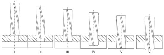 In the reaming process, the reaming edge plays a main role. The reaming edge is long and only part of it is involved in cutting. When reaming CFRP/Ti stacks, it can be divided into six stages as a whole. As shown in Figure 5, stage I is the articulation stage and the beginning stage of reaming, during which the reamer edge contacts the CFRP surface. Stage II is the steady-state reaming stage of CFRP, in which the axial force of reaming gradually increases and enters the stable stage. Stage III enters the transition zone, which is the reaming stage of CFRP. Because of the difference of performance between the titanium alloy and CFRP, the reaming axial force rises sharply and enters the reaming stage of the titanium alloy. Stage IV is the steady-state reaming of the titanium alloy, in which the reaming axial force first rises and then enters the stable stage. Stage V is the end stage of titanium alloy reaming, in which the axial force of reaming decreases and the reaming stage approaches the end. Stage VI is the end stage of laminated reaming, in which the reaming axial force decreases to zero, the reamer edge hinges on the laminated holes, and the reaming process ends.