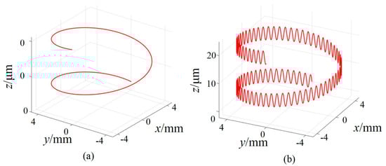 In Equation (2), A is the ultrasonic amplitude and f is the ultrasonic vibration frequency. Figure 7a shows the trajectories of the selectable points on the main cutting edge of the reamer of CR and Figure 7b shows that of UVR.