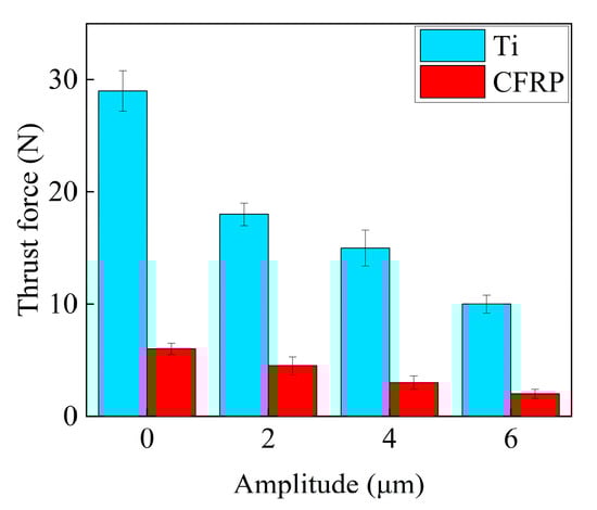 Figure 8 shows the variation of thrust force with ultrasonic amplitude through the two materials during the reaming of CFRP/Ti stacks by UVR. In the experiment, the tool speed was 600 rpm, and the feed speed was 0.41 mm/s (CFRP) and Ti (0.16 mm/s). During the reaming of the titanium alloy, the thrust force decreases with the increase of ultrasonic amplitude and reaches its minimum value when the amplitude reaches 6 μm, which is 19 N less than the thrust forces of CR. In the reaming of CFRP, the thrust forces also decrease with the increase of ultrasonic amplitude and reach their minimum value when the amplitude reaches 6 μm, which is 4 N less than thrust forces of CR. The average thrust forces in UVR decreased by 57% (Ti) and 40% (CFRP), respectively, compared to CR. Therefore, the larger the amplitude, the smaller the axial force. This is consistent with the analysis in Section 3.1.